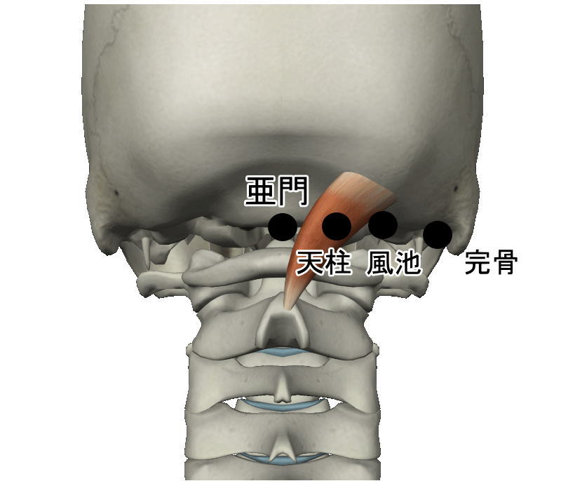 亜門 取穴法 第1、第2頸椎の間、頭を下げて後ろ髪生え際の中央を中に5分ほど入ったところの陥凹部 主治 古典 陽証の発熱で病勢が発揚して盛んなもの、鼻血、背中のこわばり、中風、舌がもつれる、頭が重くて汗が出ない、現代 脳卒中後遺症、動脈硬化症による下のもつれ、頭痛、頭重、鼻血、高血圧のよる随伴症状、精神病や癲癇 穴名由来 123 解剖 筋肉 項靭帯 棘間筋運動神経 脊髄神経後枝知覚神経 項神経後枝動脈 頚横動脈